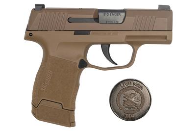 The NRA P365 features a coyote tan grip and slide, with all the same features of the award-winning SIG SAUER P365 everyday, concealed carry pistol This high capacity, micro-compact pistol is smaller and lighter than other pistols in its class featuring a high-capacity, patented modified double-stack magazine for a 10+1 full-size capacity. This unique package includes the popular 12-round magazine giving the P365 a 13-round capacity.