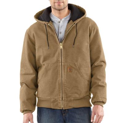 Carhartt Mens Sandstone Quilted Flannel Lined Jacket. Constructed of 12-ounce 100 percent cotton Black Sandstone Duck fabric made from plied yarns for durability. The fabric is micro-sanded and garment washed for a soft hand. The Carhartt jacket is lined with 100 percent polyester quilted flannel heavyweight lining for warmth. The sleeves are lined with nylon for easy on and off. Cut with a work fit for better range of motion and comfort. There is an attached Carhartt quilted flannel-lined three-piece hood with an adjustable tipped drawcord. Zipper front, front hand warmer pockets, and an inside welt pocket with zipper closure on the right side for secure storage. Inside patch pocket with hook and loop closure on the left side for added convenience. It also has rib-knit cuffs and a bottom band.