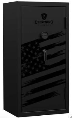 Call for local delivery options and price. Browning MP Blackout 33. Gloss Black Paint with Flag and Black Chrome Hardware. Electronic Lock. External Dimensions: 58H x 29W x 24D. Long Gun Capacity: 33. Weight: 560 lbs. Fire Rating: 1550 degree for 80 minutes/ 1200 degree for 95 minutes. 12-Gauge Steel Walls. 1" Formed Door.