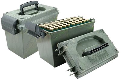 The SD-100 shotshell dry boxes hold 100 shotshells in two removable trays. The lid has an O-Ring design for water-resistant sealing and is removable for a less space needed in the hunting blind. This tough box has a generously-proportioned fold-down handle for transport and large latch for easy opening. The 12-gauge model holds shells up to 3.5 inches. The 20-gauge model holds shells up to 3 inches. Shotshell Dry Box is finsihed in MTM's green Wild Camo.