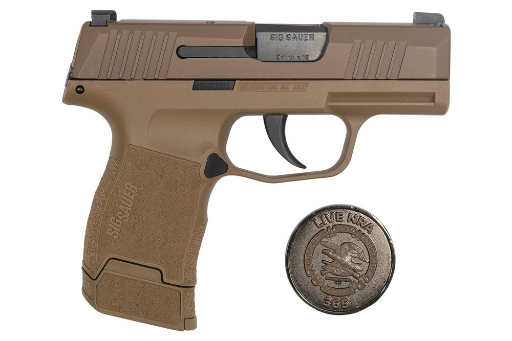 The NRA P365 features a coyote tan grip and slide, with all the same features of the award-winning SIG SAUER P365 everyday, concealed carry pistol This high capacity, micro-compact pistol is smaller and lighter than other pistols in its class featuring a high-capacity, patented modified double-stack magazine for a 10+1 full-size capacity. This unique package includes the popular 12-round magazine giving the P365 a 13-round capacity.