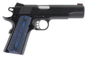 Colt's 1911 Competition pistol features custom G10 blue grips with a scallop texture and the Colt logo, dual recoil spring system, a National Match barrel. It has Novak sights for precision shooting; a fiber optic front with adjustable rear sight. It comes with two magazines and spare sight fibers. This model has a blued carbon steel metal finish and a 70 series firing pin system.