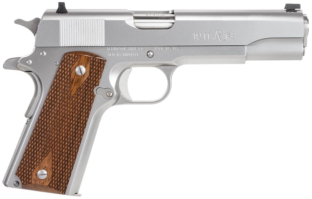 Remington's Model 1911 R1 is a fine blend of exacting craftsmanship and out-of-box performance. It features a crisp trigger, dovetailed front and rear sights, precision-machined slide and frame, and Double Diamond checkered American walnut grips. It ships with two 7-round magazines. This model has a stainless steel metal finish.