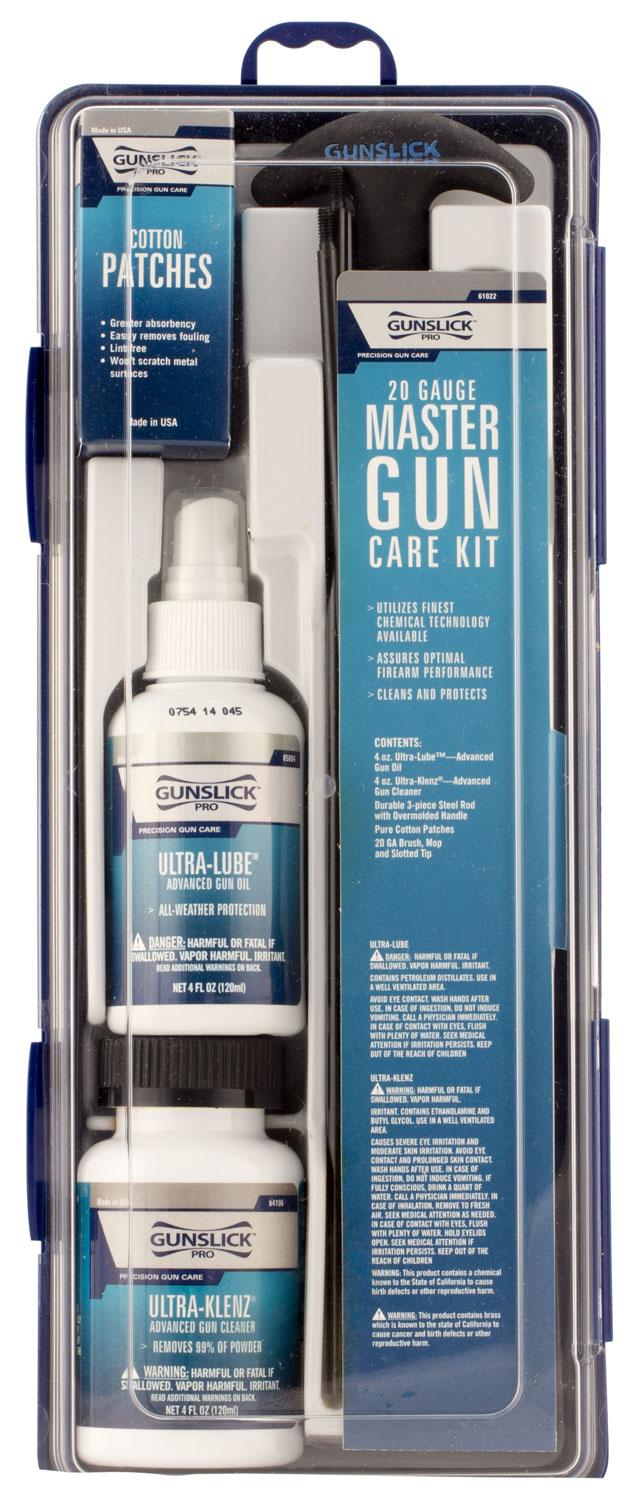 This kit contains 4 ounces of Ultra-Lube, 4 ounces of Ultra-Klenz, blacked steel rod with "soft grip" handle, muzzle guard, phosphor brushes, wool mops, cotton patches and cleaning tips and jags. All this stores in a reusable storage box.