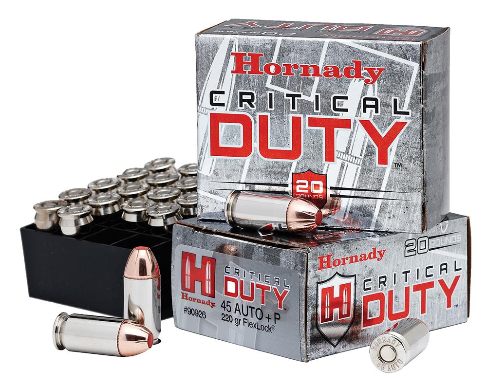 Critical Duty features a high-antimony lead core that is extremely tough and delivers controlled expansion. It also provides a more economical choice than similar bonded bullets. The FlexLock bullet incorporates two revolutionary Hornady features: the no-clog, patented Flex Tip design and the heavy-duty jacket-to-core InterLock band. It utilizes a large mechanical jacket-to-core InterLock band that keeps the bullet and core from separating for maximum weight retention and proven terminal performance through. Nickel plating resists corrosion and greatly enhances low-light chamber checks while combining the cannelured bullet with a crimped case ensures no bullet setback during feeding.