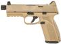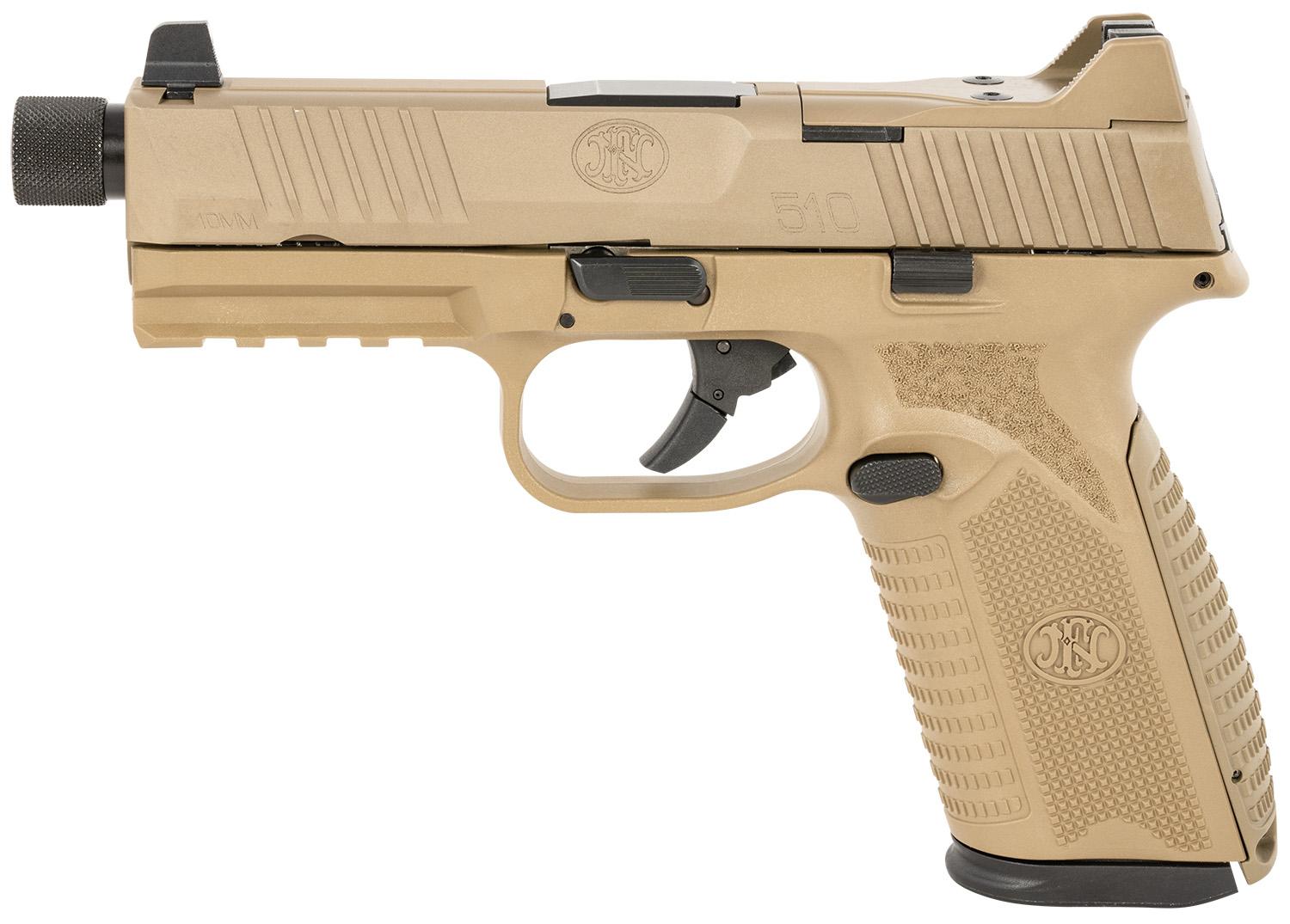 The FN 510 Tactical carries 22+1 rounds of 10mm Auto at the ready, giving you the stopping power you need to face any scenario. Made red dot-ready with a crisp trigger; polished feed ramp and chamber; threaded .578"x28 to mount compensators and suppressors; Tritium lamp steel dovetail sights, co-witness with most MRD optics; high-endurance conical striker; interchangeable backstraps; MIL-STD-1913 rail; fully ambidextrous slide stop lever and magazine release. Includes two interchangeable backstraps, two magazines, four MRD mounting plates, owners manual, locking device and zippered case.