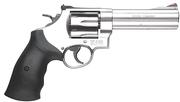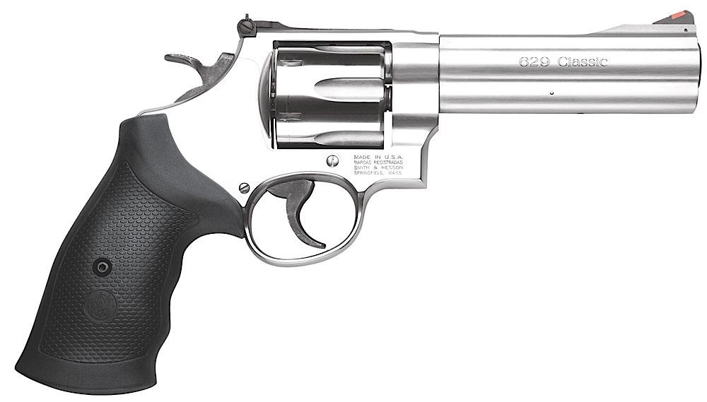 Smith & Wesson's large frame revolver is the first choice for handgun hunters and competitive shooters. The Smith & Wesson Model 629 is an N frame single/double action revolver with a black synthetic grip, stainless steel barrel, frame, and cylinder. It has red ramp front and adjustable white outline rear sights, and an overall length of 10.5". This Classic model has a 5" barrel.