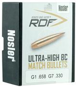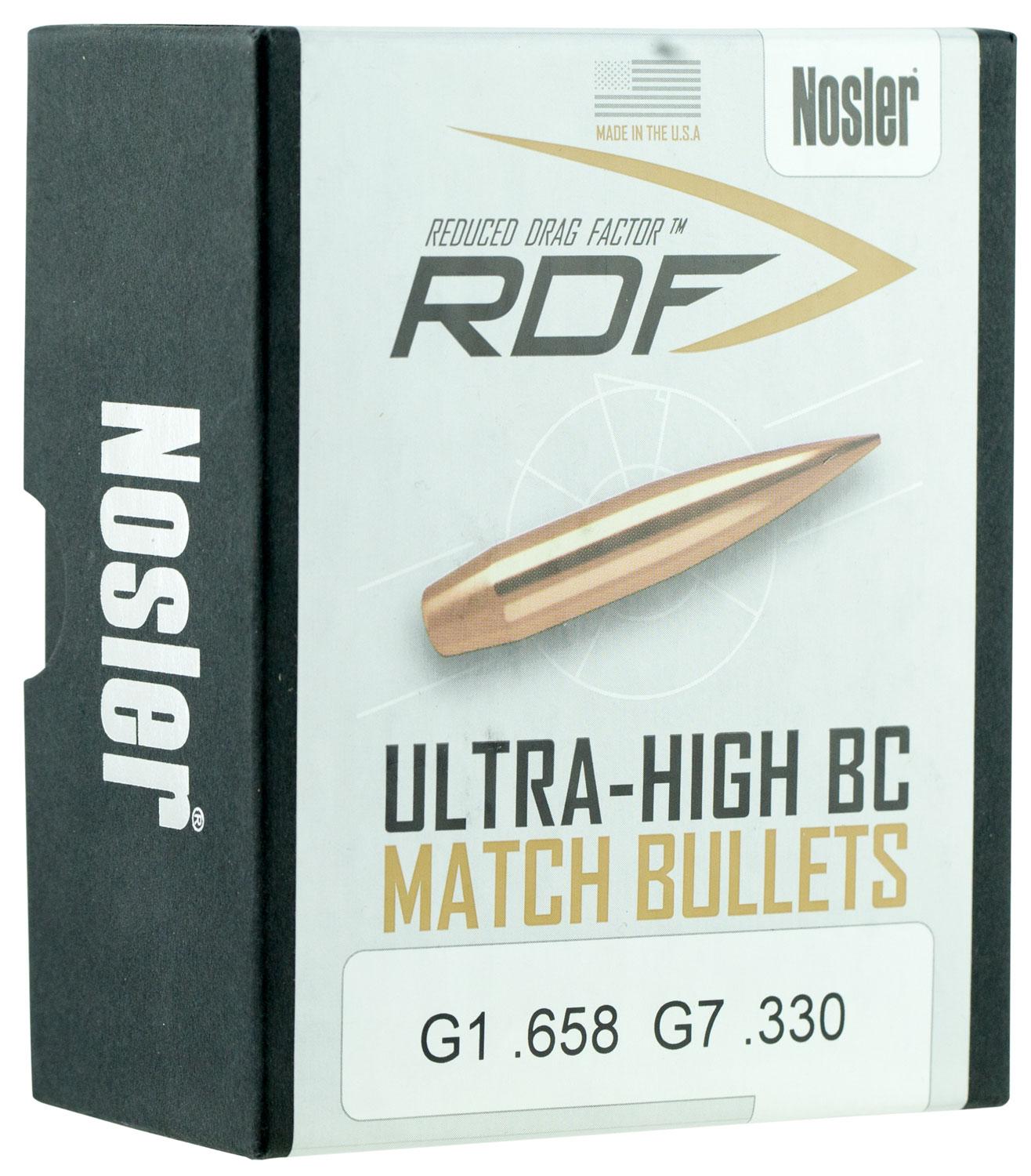 For those wanting to squeeze the most performance from their competition rifle, Nosler's RDF (Reduced Drag Factor) match bullet line is the ideal choice. The RDF line was designed from the ground up to provide exceptionally high BCs, which create the flattest trajectory and least wind drift possible. The keys to the RDF's outstanding performance are Nosler's meticulously optimized compound ogive and long, drag-reducing boattail, which make handloading a snap and create an incredibly sleek form factor. RDF bullets also have the smallest, most consistent meplats of any hollow point match bullet line, so there is no need to point or trim tips.