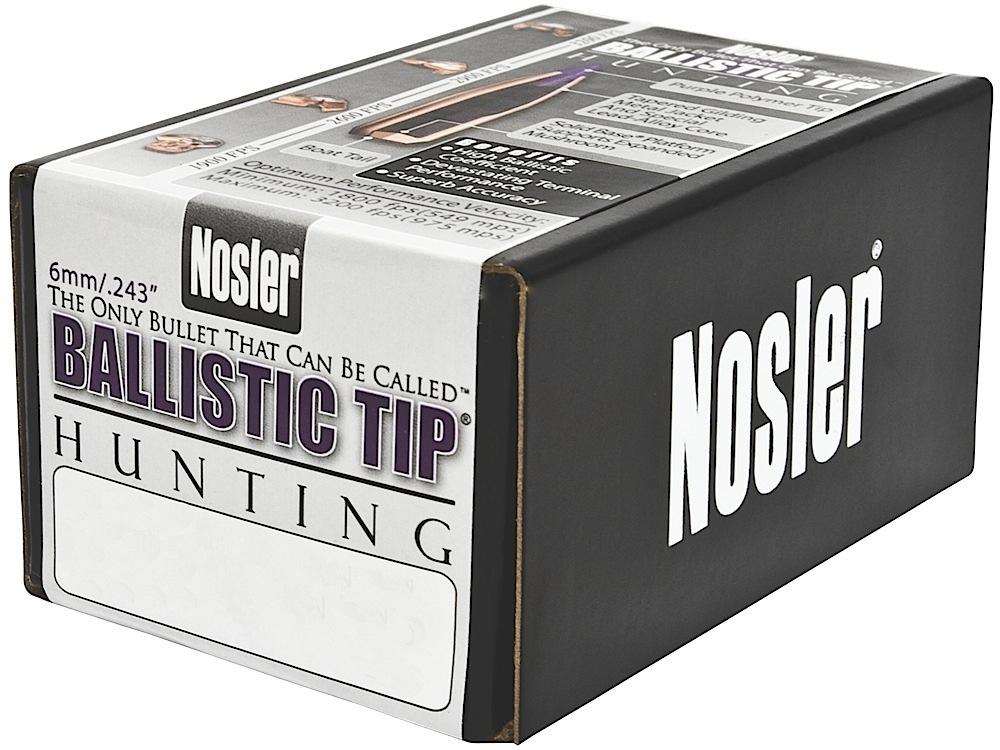 Nosler engineered the Ballistic Tip Hunting bullet to be very predictable and extremely forgiving. The polymer tip resists deformation in the magazine, initiates expansion upon impact, and is color-coded by caliber. The fully tapered jacket and special lead alloy core allows controlled expansion and optimum weight retention at all practical velocity levels. A heavy jacket base prevents bullet deformation during firing and acts as a platform for large diameter mushroom. Nosler's unique solid base boat-tail design, combined with the polycarbonate tip, dramatically increases long-range ballistic efficiency.