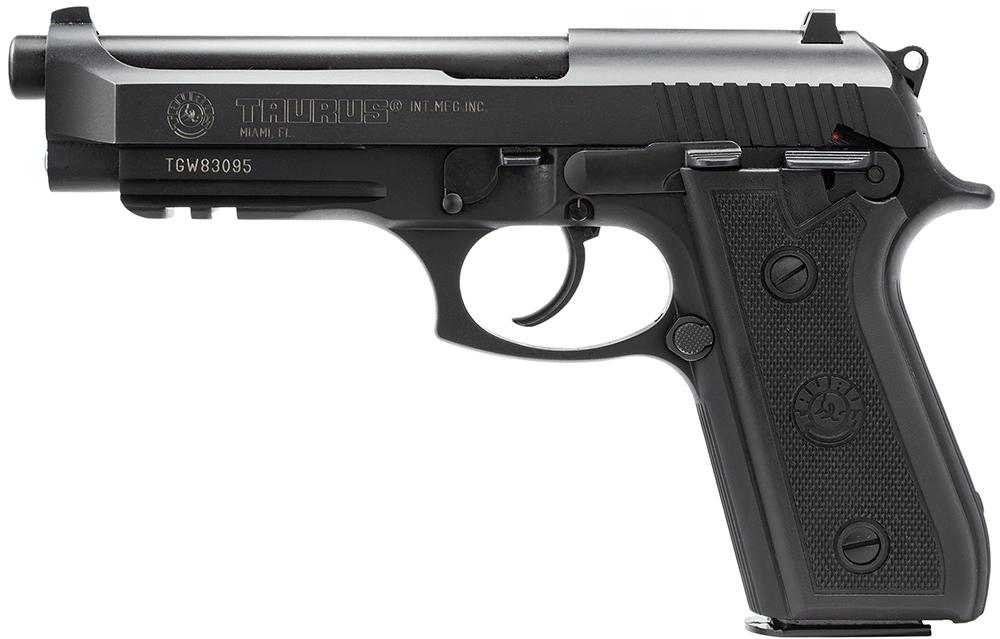 The Taurus 92 pistol was created to improve on the Beretta design. The specially-designed drop hammer-forged ordnance-grade alloy frame won't crack or allow the slide to come off, and a three-position frame-mounted ambidextrous safety allows for a classic SA "cocked-and-locked" mode and also functions as a DA decocking lever. The Taurus 92 also features a loaded chamber indicator, the Taurus Security System, a Picatinny rail, and fixed 3-Dot sights.