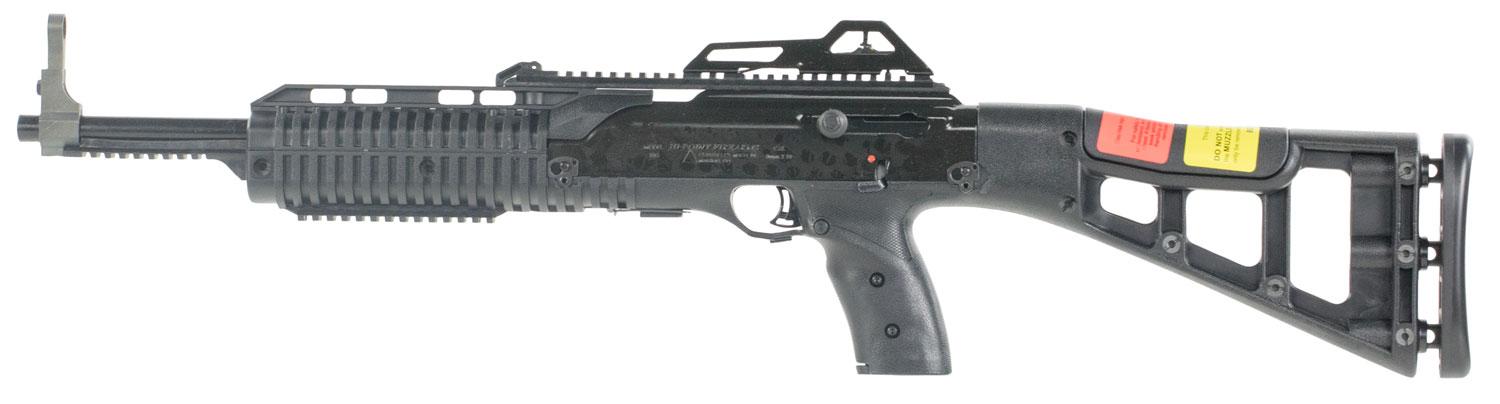 Hi-Point's 995TS 9mm carbine has an all-weather, polymer skeletonized stock with an internal recoil buffer, multiple Weaver-style rails, a sling, swivels, and scope base. It has a quick on/off thumb safety, grip-mounted clip release, last round lock open feature, and fully adjustable sights (post front, peep rear). The 995TS carbine has a 16.5" barrel for an OAL of 31". Hi-Point produces affordable, American-made firearms featuring 100% American parts and assembly. Hi-Point carbines are +P rated and accept all factory ammunition. This model has a black stock with black metal finish and includes a 10-round magazine. (The mag is not compatible with the C9)