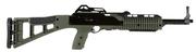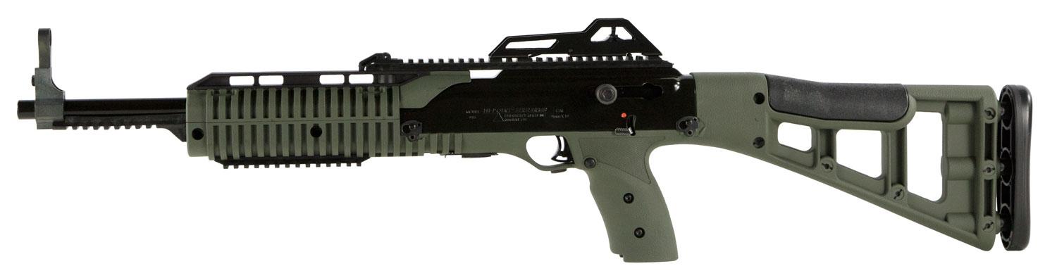Hi-Point's 995TS 9mm carbine has an all-weather, polymer skeletonized stock with an internal recoil buffer, multiple Weaver-style rails, a sling, swivels, and scope base. It has a quick on/off thumb safety, grip-mounted clip release, last round lock open feature, and fully adjustable sights (post front, peep rear). The 995TS carbine has a 16.5" barrel for an OAL of 31". Hi-Point produces affordable, American-made firearms featuring 100% American parts and assembly. Hi-Point carbines are +P rated and accept all factory ammunition. This model has an OD Green stock with black metal finish and includes a 10-round magazine. (The mag is not interchangeable with C9)