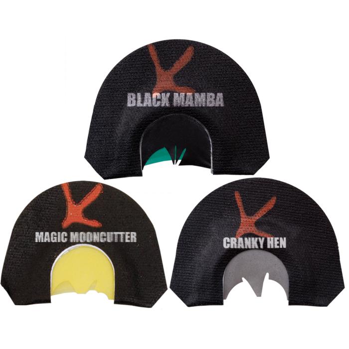 The Black Mamba is a very unique cut call designed to give the hunter a very user-friendly call but a call that will bark out raspy deep turkey sounds. Knight & Hale call it the viper combo cut. The call gives the best of a v-cut styles as well as a cutter cut style. This combo may set a new standard for mouth calls. Made with a custom-blended black latex .004 top reed and two .025 green latex bottom reeds.