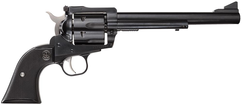 Ruger's Blackhawk revolver meets the needs of today's single-action shooters. The patented transfer bar mechanism and loading gate interlock provide an unparalleled measure of security against accidental discharge. Its cold hammer-forged barrel results in ultra-precise rifling that provides exceptional accuracy, longevity and easy cleaning. The Blackhawk also has ramp front and adjustable rear sights along with traditional western-style, hand-filling grip. This model has a 7.5" blued barrel, frame, and cylinder. It also has black rubber girp.