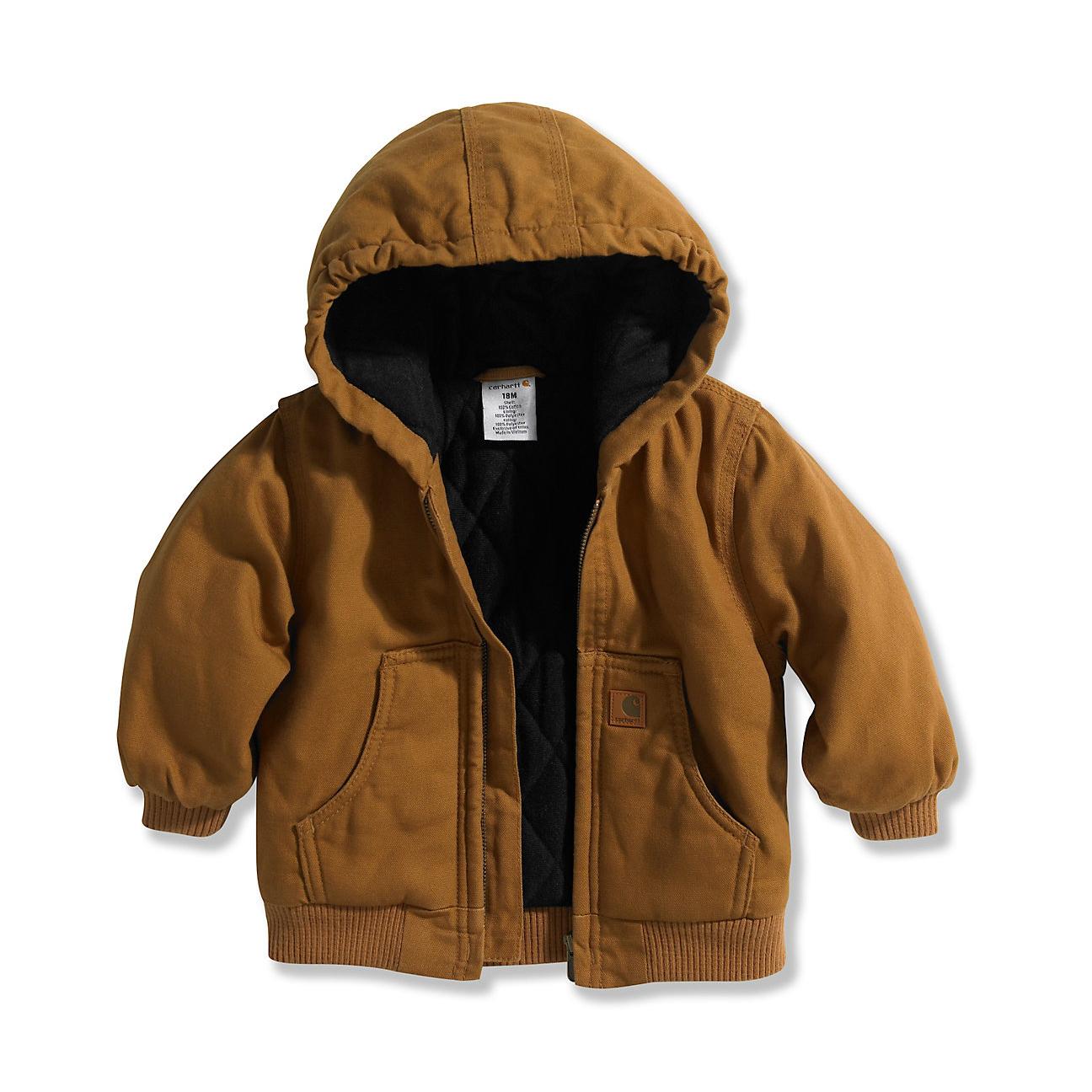Carhartt Toddler Active Jacket. Flannel quilt lined. Duck jacket with brushed tricot lined hood. Triple-stitched main seams. Insulated front pockets and rib cuffs and bottom hem. Quilted taffeta lining in sleeves. Carhartt logo label on front pocket and name tag label on inside pocket. Fabric: 9-ounce, 100 percent cotton canvas. Lining: 100 percent polyester quilted brushed tricot. Sleeve Lining: 100 percent polyester quilted taffeta. Trim: 100 percent cotton 2x2 rib