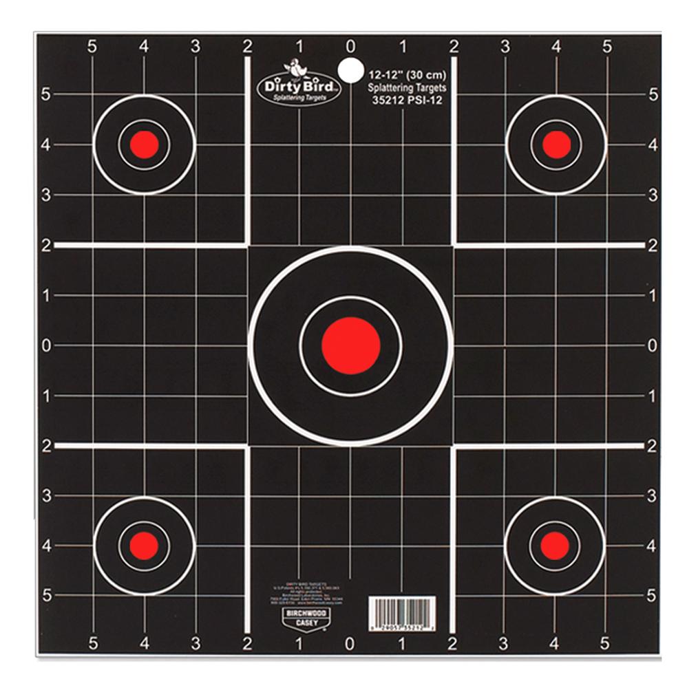 The name comes from the splatter of white that appears upon bullet impact, which allows you to immediately spot each shot. These targets are a great value and simple to use both indoors and outdoors. The black and white contrast of these splattering targets is perfect for reading shot groups. The non-adhesive back also allows you to affix to a surface as you wish, add notes and then easily save the targets for future reference. Why use paper targets when you can enjoy the splatter of Dirty Birds targets? And with the price per target comparable to paper, Dirty Bird targets are not only easy on your eyes, they're easy on your wallet. Use this large 12" x 12" sight-in target for sighting-in up to 400 yards away. Five bulls-eye targets come with aiming points for open or scoped sights making it easy to check different ballistic loads for more shooting fun. Complete with 1" grid pattern and stadia lines making sighting-in a snap.