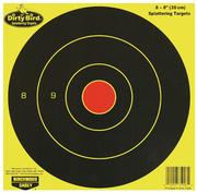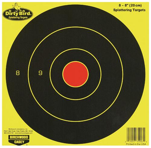 These targets offer yellow reaction to the classic Dirty Bird splattering performance, allowing superior downrange contrast to immediately spot each shot. These targets are a great value and simple to use both indoors and outdoors. The 8" round targets are ideal for near and midrange shooting using a variety of calibers. The non-adhesive back also allows you to affix to a surface as you wish, add notes and then easily save the targets for future reference.