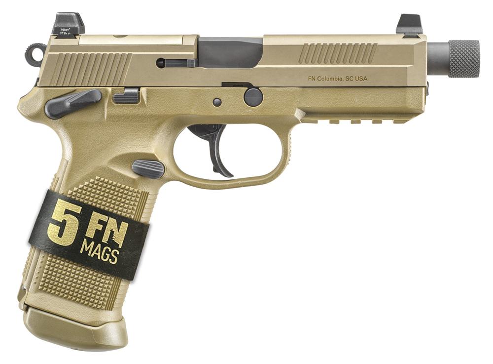 The FNX 45 Tactical is the latest advancement in handgun engineering, offering .45 ACP performance and a package of unique features. The checkered polymer frame has a low-bore axis for reduced felt recoil and enhanced operator controls. Interchangeable backstraps come standard to quickly customize the grip feel and all operating controls are fully ambidextrous. The cold hammer-forged, stainless steel barrel has a threaded muzzle to accept sound suppressors, compensator's and other accessories while the slide has night sights and includes two mounting bases to accept multiple styles of optional red-dot electronic sights. Includes 5 15rd magazines, two interchangeable backstraps w/lanyard eyelets and two mounting bases.