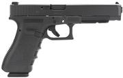 The Glock 34 Competition has an extended barrel, longer slide dimensions and elongated distance between sights. It features Glock's Safe Action system which provides a consistent trigger pull from the first to the last round. The three automatic independently operating mechanical safeties are built into the fire control system of the pistol. All three safeties disengage sequentially as the trigger is pulled and automatically reengage when the trigger is released. The frame is made of polymer with hardened steel guides. It features an ideal grip angle and low weight. The slide stop lever and the magazine catch are easily operated with the shooting hand. The advanced surface treatment of the slide results in optimal hardness by considerably reducing wear and tear and it makes it corrosion resistant, even when operating in saltwater conditions. The matte surface minimizes light reflection. The barrel is mechanically locked and cold-hammer forged. It also has the same advanced surface treatment as the slide. Its extractor serves as a loaded chamber indicator to comply with the laws of certain states and its position may visually and physically indicate whether there is a cartridge in the chamber of the pistol.
