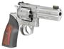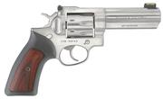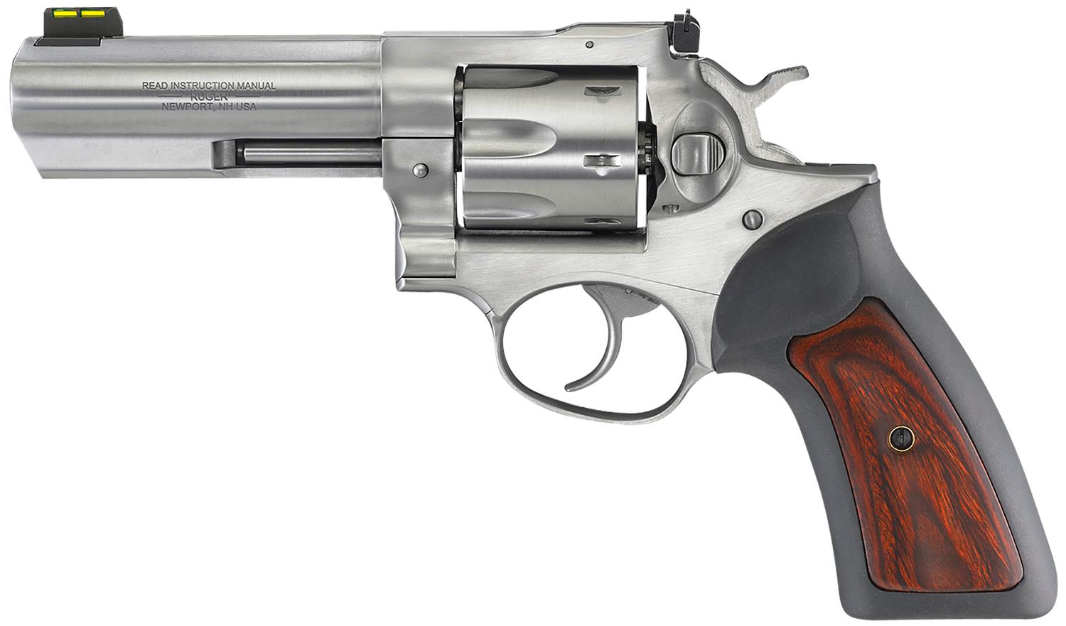 Ruger's GP100 revolver features a triple-locking cylinder that is locked into the frame at the front, rear and bottom for more positive alignment and dependable operation. Its patented transfer bar mechanism provides an unparalleled measure of security, while the integrated sub-assemblies allows for easy maintenance and assembly. The grip frame design easily accommodates a wide variety of custom grips. This Standard model has a stainless steel 4.2" barrel, frame, and cylinder. It also has a black rubber grip with a hardwood insert and a fiber optic front sight with an adjustable rear.