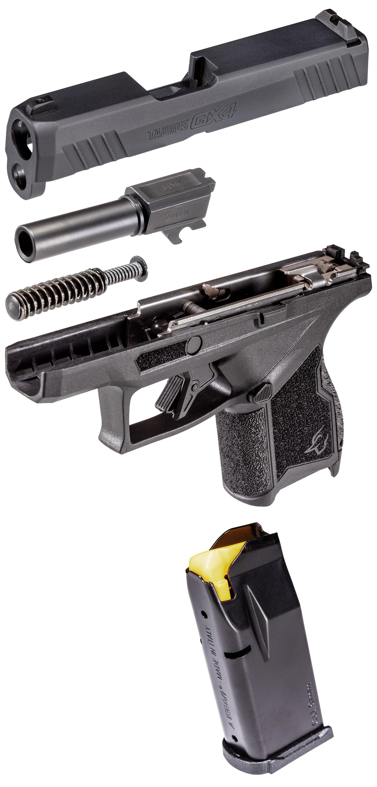 The Taurus GX4 was crafted for EDC readiness and reliability. From its no-snag profile to its short trigger reset to its simplified, lightweight design, the Taurus GX4 delivers the concealability of a 380 with the power and performance of a full size, offering everything you would expect from a full-frame defensive handgun at a fraction of the size and weight. Features easy take down pin for disassembly; flat face serrated trigger for better comfort and control; serrated steel adjustable rear sight, steel front sight with white dot; magazine and grip cuts to aid in magazine stripping if required; reversible mag release; signature indexing and recoil management pad (RMP). Includes two magazines.