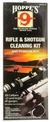 Hoppe's Pistol Cleaning Kit is convenient, and well thought out. The kit includes Hoppe's No. 9 Solvent 2 oz., lubricating oil 2.25 oz., round cotton patches, slotted ends and adapters (where appropriate), and an aluminum cleaning rod. It comes in a reusable plastic box.