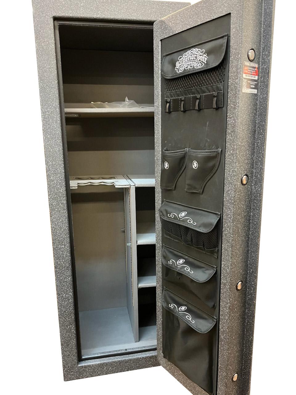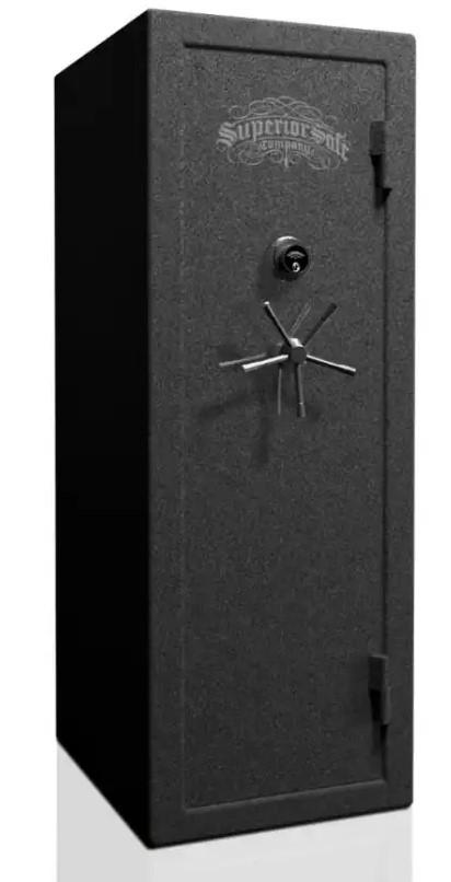 Call for local delivery price and options. Superior Ironside 15 Gun Safe. Fire Rating: 1400 degrees - 60 minutes Dimensions: 22" W x 60.5" H x 22.5" D Gun Capacity: 15, Granite Textured Paint. Weight: 450 lbs. Dial Combination lock. 12-Gauge Steel Body 4-1/4-Thick Double Plate Steel Door 12-Gauge Outer Steel, Full 14-Gauge Inner.7/16 Reinforced Door Edge. Three-Spoke Handle