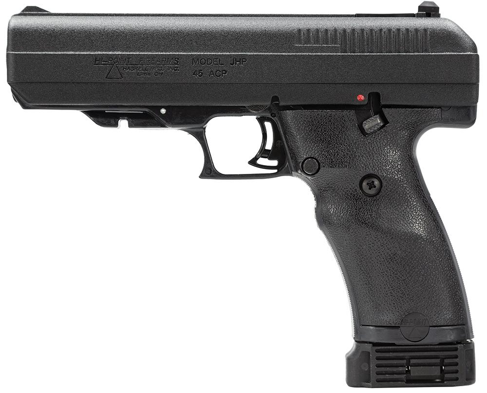 The Hi-Point 45 ACP has a 4.5" barrel with an overall length of 7.75". It has a high-impact polymer frame with high-impact grips and a black powder coat finish. The durable, easy-grip finish assures a firm, comfortable grip and exceptional recoil control. It has an 10+1 capacity and a quick on/off thumb safety, magazine disconnect safety and last round lock open feature. It has 3-dot sights with a fully-adjustable rear and an additional rear peep sight. Hi-Point handguns are +P rated and accept all factory ammunition. Each comes with a free trigger lock.