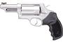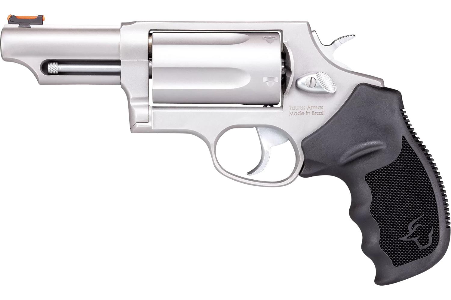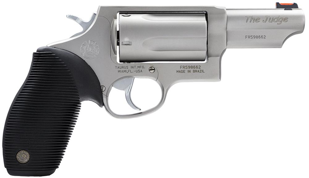 The Taurus Judge is named for the many judges who carry it into the courtroom for their protection, and it is capable of chambering both 410 gauge with 2-1/2" shotshell and the 45 Colt. This combo is ideal for short distances where most altercations occur and for longer distances with the 45 Colt ammo. This model is fully customized with fixed rear sights, fiber optic front sights, and finger grooved rubber grip. The safety features on this model include the Taurus Security System and a transfer bar. This model has a stainless steel metal finish and 3" barrel.