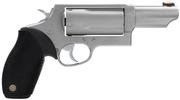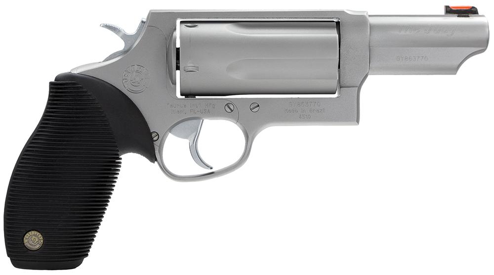 The Taurus Judge Magnum is capable of chambering both .410 gauge 2.5" or 3" shotshells and 45 Colt ammunition. This amazing combo is ideal for short distances where most altercations occur, or longer distances with the 45 Colt ammo. Taurus has finely tuned the rifling to spread the shot pattern at close quarters or to guide the .45 caliber bullet to the target. This model has a 3" barrel with a fiber optic front sight and fixed rear. It has a matte stainless steel metal finish and a black Ribber grip.