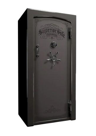 Call for local delivery options and price. Gloss Two Tone Gunsmoke Paint with Black Chrome Hardware. SG Electronic Lock. External Dimensions: 30" W x 66.5" H x 26.5" D. Long Gun Capacity: 36. Weight: 850 lbs. Fire Rating: 1650 degree for 90 minutes. 10-Gauge Steel Walls. 4.5"-Thick Double Plate Steel Door. 3/16"- Outer Steel, Full 12-Gauge Inner 3/4" Reinforced Door Edge.
