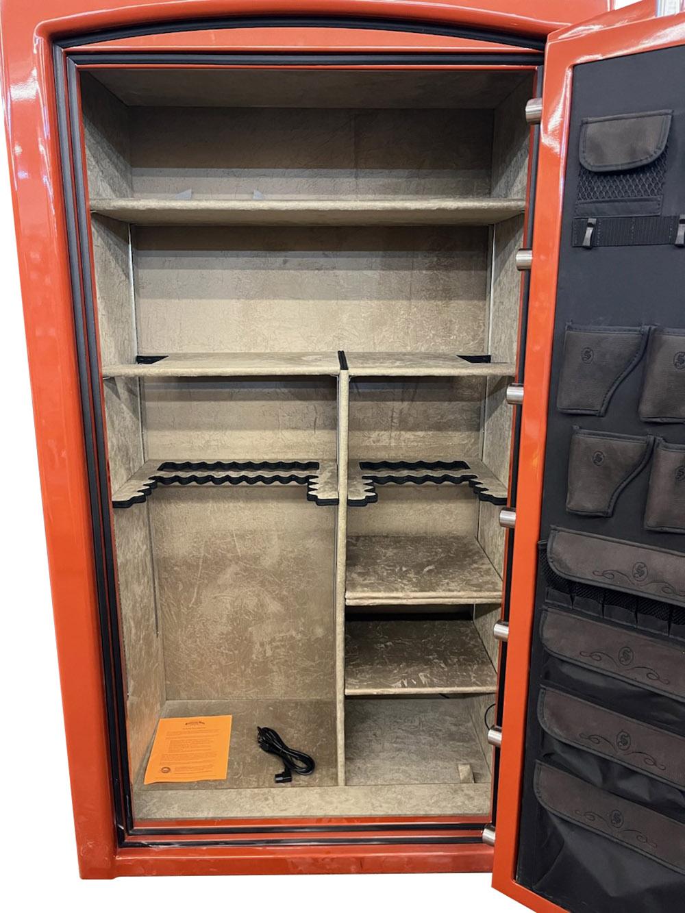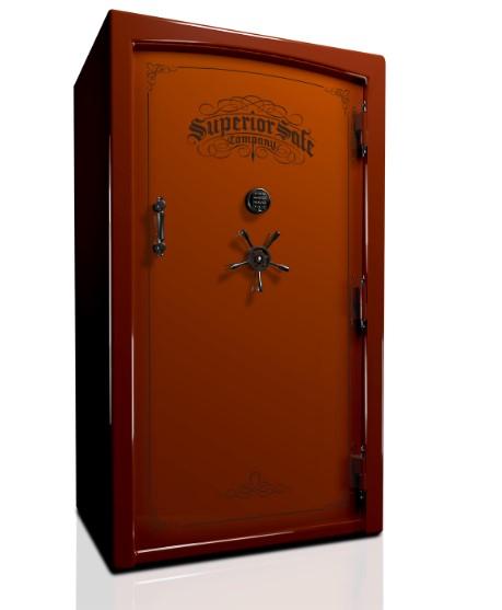 Call for local delivery options and price. Superior Master 50 Gun Safe. Gloss Two Tone Sunburst Orange Paint with Black Chrome Hardware. SG Electronic Lock. External Dimensions: 42" W x 72.5" H x 32.5" D. Long Gun Capacity: 58. Weight: 1225 lbs. Fire Rating: 1650 degree for 90 minutes. 10-Gauge Steel Walls. 4.5"-Thick Double Plate Steel Door. 3/16"- Outer Steel, Full 12-Gauge Inner 3/4" Reinforced Door Edge.