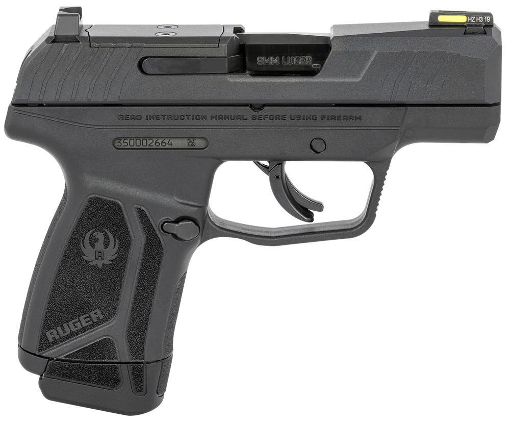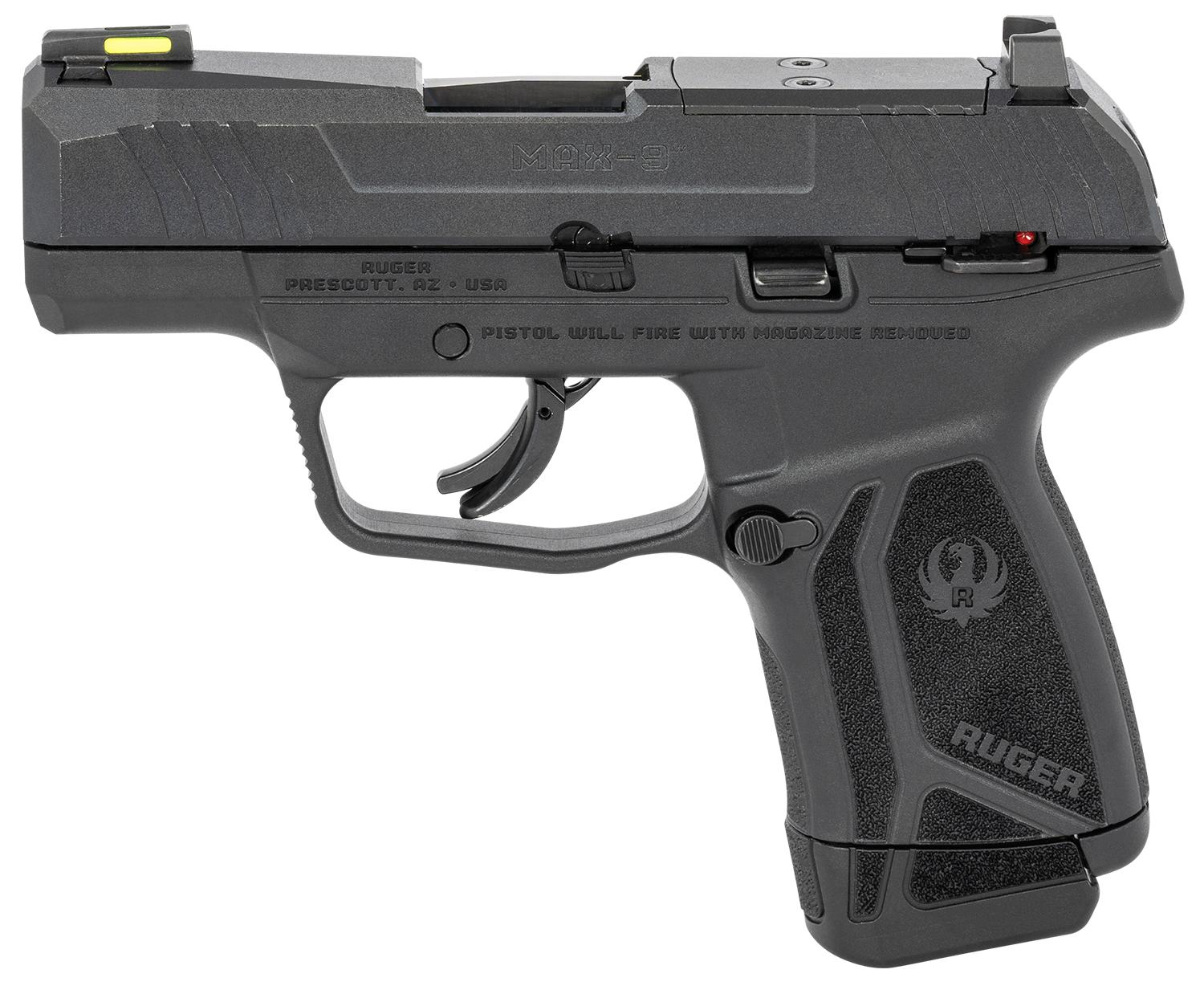 The Ruger Max-9 is slim, lightweight and compact for personal protection. It's striker-fired with a short, smooth trigger pull, clean break and positive reset. It also features rugged construction with through-hardened alloy steel slide; one-piece, precision-machined fire control chassis; and high-performance, glass-filled nylon grip frame. The slide is optic ready for direct mounting of co-witnessed JPoint and Shield-pattern micro red dot sights. It utilizes tritium fiber optic day/night front sight for high visibility and drift adjustable rear sight.
