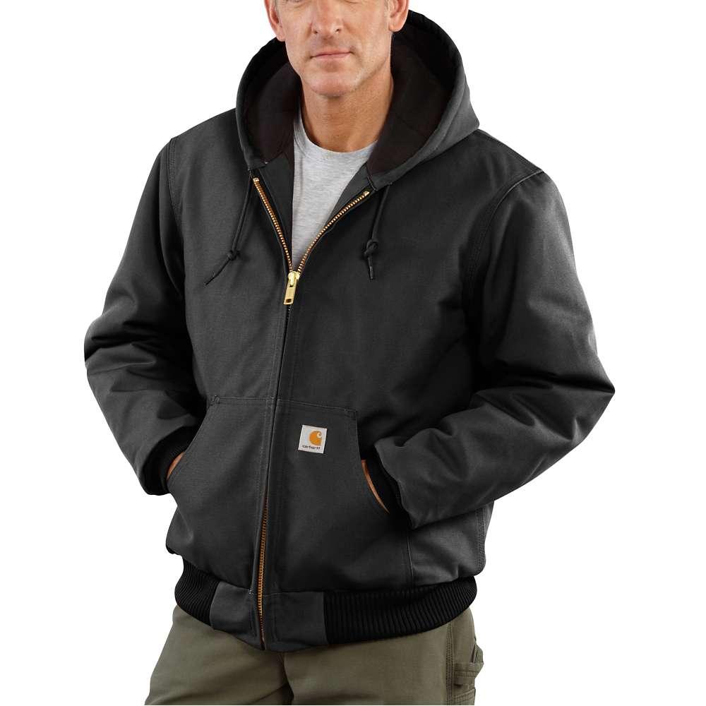 Carhartt Mens USA Made Flannel Lined Duck Active Jacket. This stylish Carhartt Jacket uses a 12 ounce, firm-hand, 100 percent ring-spun fabric with plied yarns. Within this advanced American made jacket, you``ll enjoy 100 percent polyester, paired with an excellent heavy duty quilt flannel lining in key placement areas. Additional features include an attached quilted flannel lined hood, with standard adjustable drawcord.