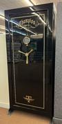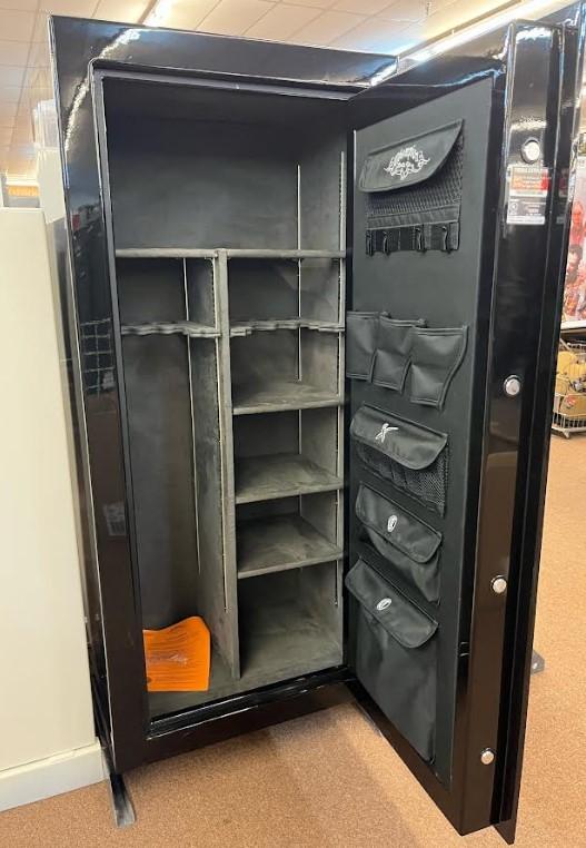 Call for local delivery price and options. Champion Model T Gloss Black Paint with Gold Hardware. Fire Rating: 1200 degrees - 60 minutes Dimensions: 28" W x 60.5" H x 22.5" D Gun Capacity: 24 Weight: 490 lbs SG electronic lock. 12-Gauge Steel Body 4-1/4-Thick Double Plate Steel Door 12-Gauge Outer Steel, Full 14-Gauge Inner 7/16 Reinforced Door Edge Three-Spoke Handle