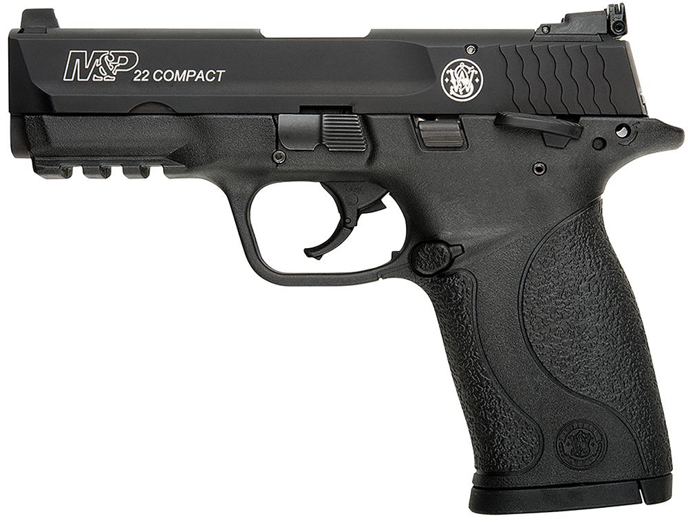 The Smith & Wesson M&P has a reinforced polymer chassis, superior ergonomics, reversible magazine release, ambidextrous controls and proven safety features. The M&P22 Compact model features a black polymer frame with a Picatinny rail, black Armornite aluminum slide, threaded barrel and 3-dot sights with an adjustable rear. Includes two magazines.