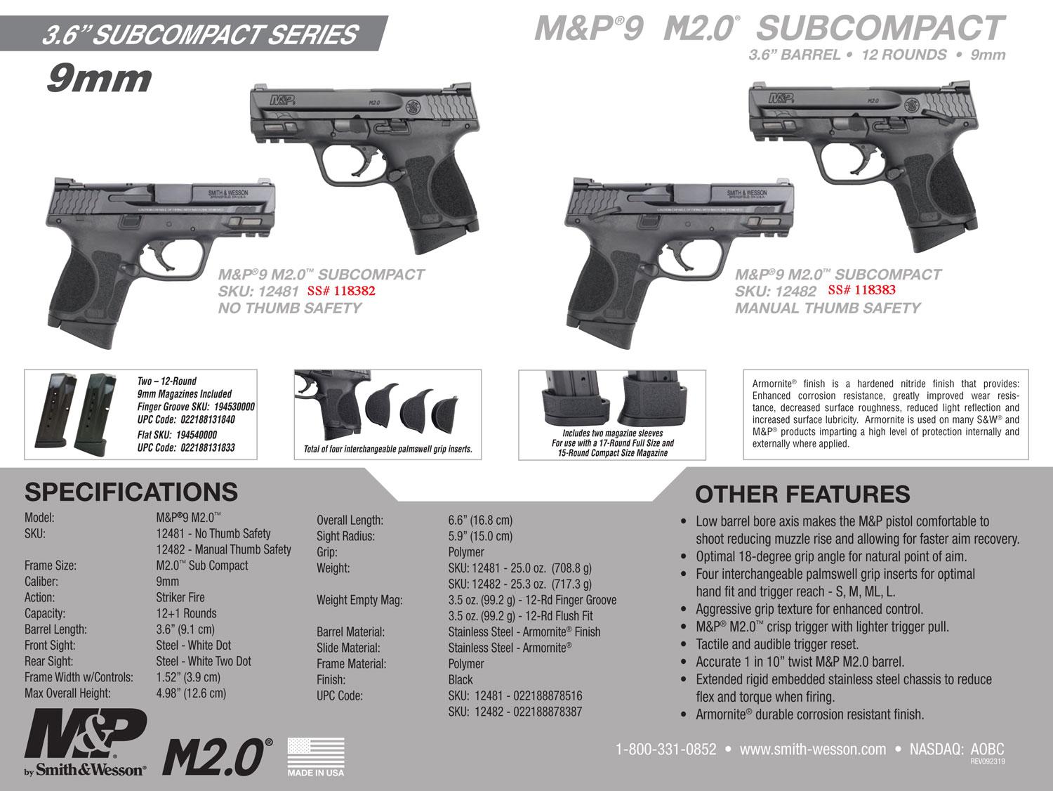 The latest addition to the M2.0 family, the M&P M2.0 Subcompact pistol features a smaller, sub-compact frame that's ideal for concealed carry. With a 12+1 round capacity in 9mm, the M&P M2.0 sub-compact pistol series includes the full array of M&P M2.0 enhancements.