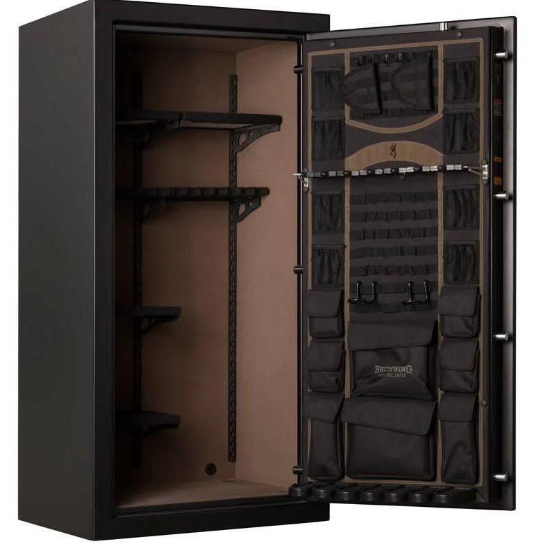 Call for local delivery options and price. Browning MP Blackout 33. Gloss Black Paint with Flag and Black Chrome Hardware. Electronic Lock. External Dimensions: 58H x 29W x 24D. Long Gun Capacity: 33. Weight: 560 lbs. Fire Rating: 1550 degree for 80 minutes/ 1200 degree for 95 minutes. 12-Gauge Steel Walls. 1" Formed Door.