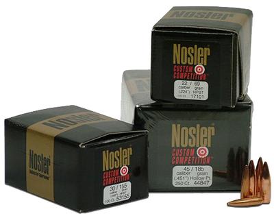Nosler has blended the accuracy of its Custom Competition bullet jackets with its own ultra-precise, form-fitted lead-alloy cores to create the performance standard for match rifle and pistol bullets. The hollow point provides a small meplat for reduced drag and increased aerodynamic efficiency while the pronounced boattail design provides efficient flight characteristics over a wide range of velocities. Highly concentric jackets, ultra precise lead alloy cores and hand inspected quality offer competitive shooters more or less.
