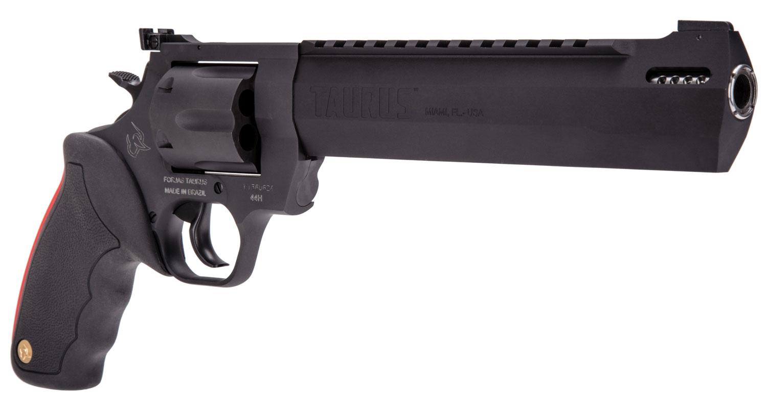Taurus' Raging Hunter is a built-to-last revolver that is a fun and effective alternative for short to medium range hunting scenarios. It features an unique barrel system which incorporates a steel sleeve that is inserted into an aluminum housing that cuts down on the overall weight, making this a well-balanced hunting sidearm. The factory-tuned porting and gas expansion chamber is designed to disperse gases directionally reducing muzzle lift and delivering quicker target acquisition. The Raging Hunter also has an optics-ready Picatinny rail, angular barrel design, and soft rubber grip. This model has a 8.375" carbon steel barrel, matte blued metal finish, grip cushion insert, and fixed front/adjustable rear sights.