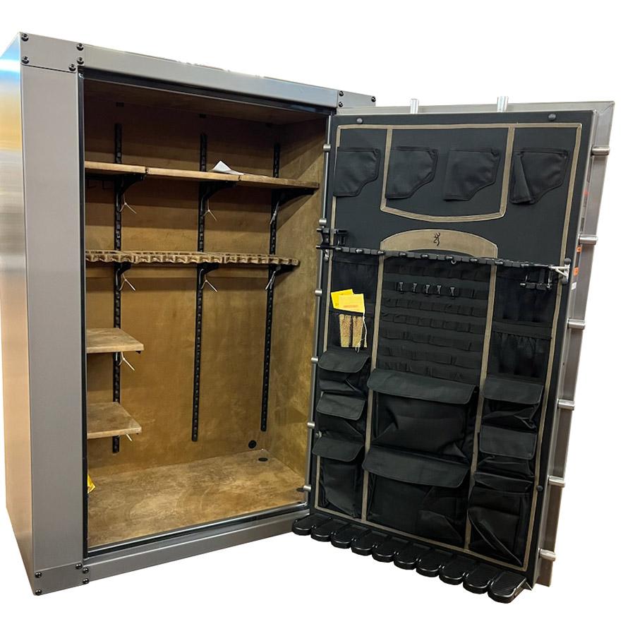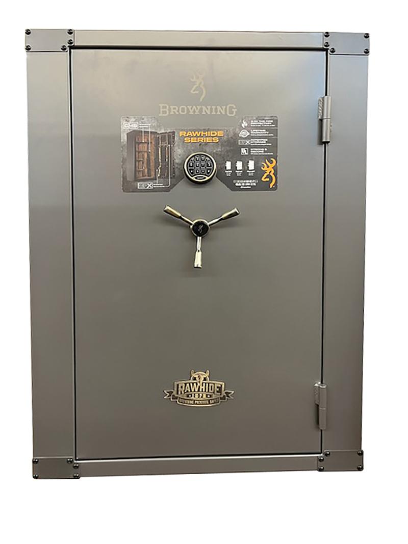 Call for local delivery options and price. RawHide 49. Raw Metal Paint with Antique Bronze Hardware. Electronic Lock. External Dimensions: 60H x 43W x 25D. Long Gun Capacity: 49. Weight: 915 lbs. Fire Rating: 1680 degree for 90 minutes/ 1200 degree for 110 minutes. 11-Gauge Steel Walls. 1" Formed Door.
