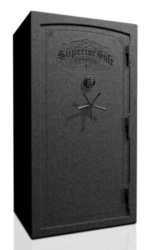 Call for local delivery options and price. Superior Regal 40 Gun Safe. Textured Granite Paint with Black Chrome Hardware. SG Electronic Lock. Internal LED Lighting. External Dimensions: 37" W x 66.5" H x 28.5" D. Long Gun Capacity: 46. Weight: 900 lbs. Fire Rating: 1500 degree for 75 minutes. 11-Gauge Steel Walls. 4.5"-Thick Double Plate Steel Door. 10-Gauge Outer Steel, Full 14-Gauge Inner 7/16" Reinforced Door Edge.