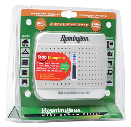 Keep your firearms and valuables safe and dry with the Remington Mini Dehumidifier. This compact unit can go anywhere without wires or extension cords. It protects firearms from excessive moisture within a 333 cubic feet enclosure and can be used for 60 days before recharging is necessary. The compact unit attracts and holds moisture through water crystal technology to protect gun safes and cabinets.