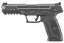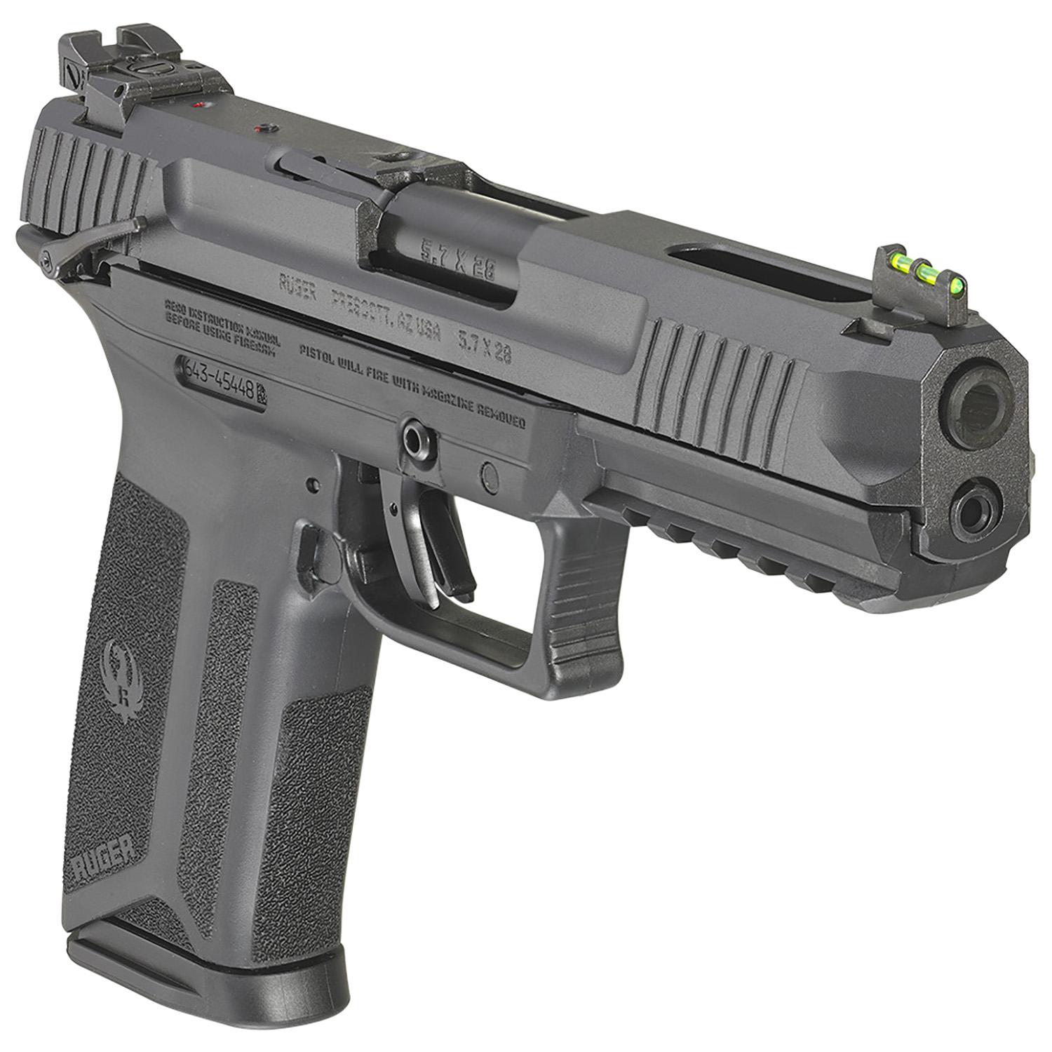 The Ruger-57 features impressive ergonomics which include an easy trigger reach, 1911-style ambidextrous manual safety, robust slide release and reversible magazine release latch. Through hardened, billet steel slide with lightening cuts is drilled and tapped for easy mounting of optics. The alloy steel barrel features a black nitride treatment for wear resistance, while the textured, ergonomic frame provides a secure and comfortable grip. It utilizes Ruger's safe, reliable and proven Secure Action fire-control system that combines a protected internal hammer with a bladed-safety trigger.
