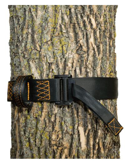 Constructed of stitched nylon webbing, a rugged steel buckle, and a double-stitched loop, this tree strap keeps you safely anchored far above the ground. Cinches tight for a secure hold (up to 300 pounds). One size fits most.