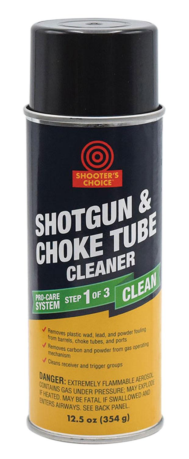 Shooter's Choice Shotgun/Choke Tube cleaner is designed specially to remove fouling from barrels, choke tubes and ports. It cleans receiver, trigger assembly, removes plastic wad fouling, lead shot fouling, and powder fouling carbon build up in operating mechanism.