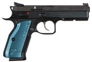 CZ's Shadow 2 model has a swappable mag release with an adjustable, extended button with three settings. A hardy nitride coating covers the entire pistol, while the frame gets an additional layer of CZ's black Polycoat finish. Its aluminum grips has checkering to match the fine front and backstrap checkering. The slide also has a front fiber optic with a black HAJO rear. This model has a 4.8" barrel, blue grip, and ambidextrous safety.