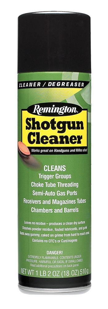Remington Shotgun Cleaner cleans trigger groups, gas ports, choke tube threading, receivers, chambers, barrels and magazine tubes, while dissolving powder residue, fouled lubricants, burnt carbon deposits and gunk. This shotgun cleaner blasts away gummy caked-on grime from hard to reach areas such as ejectors, firing pin assemblies, trigger components and bolt recesses. Also works great on shotguns, rifles and handguns. Safe for polymers - will not damage magazines, gun stocks, camo finishes or grips.