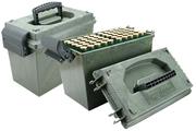 The SD-100 shotshell dry boxes hold 100 shotshells in two removable trays. The lid has an O-Ring design for water-resistant sealing and is removable for a less space needed in the hunting blind. This tough box has a generously-proportioned fold-down handle for transport and large latch for easy opening. The 12-gauge model holds shells up to 3.5 inches. The 20-gauge model holds shells up to 3 inches. Shotshell Dry Box is finsihed in MTM's green Wild Camo.