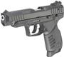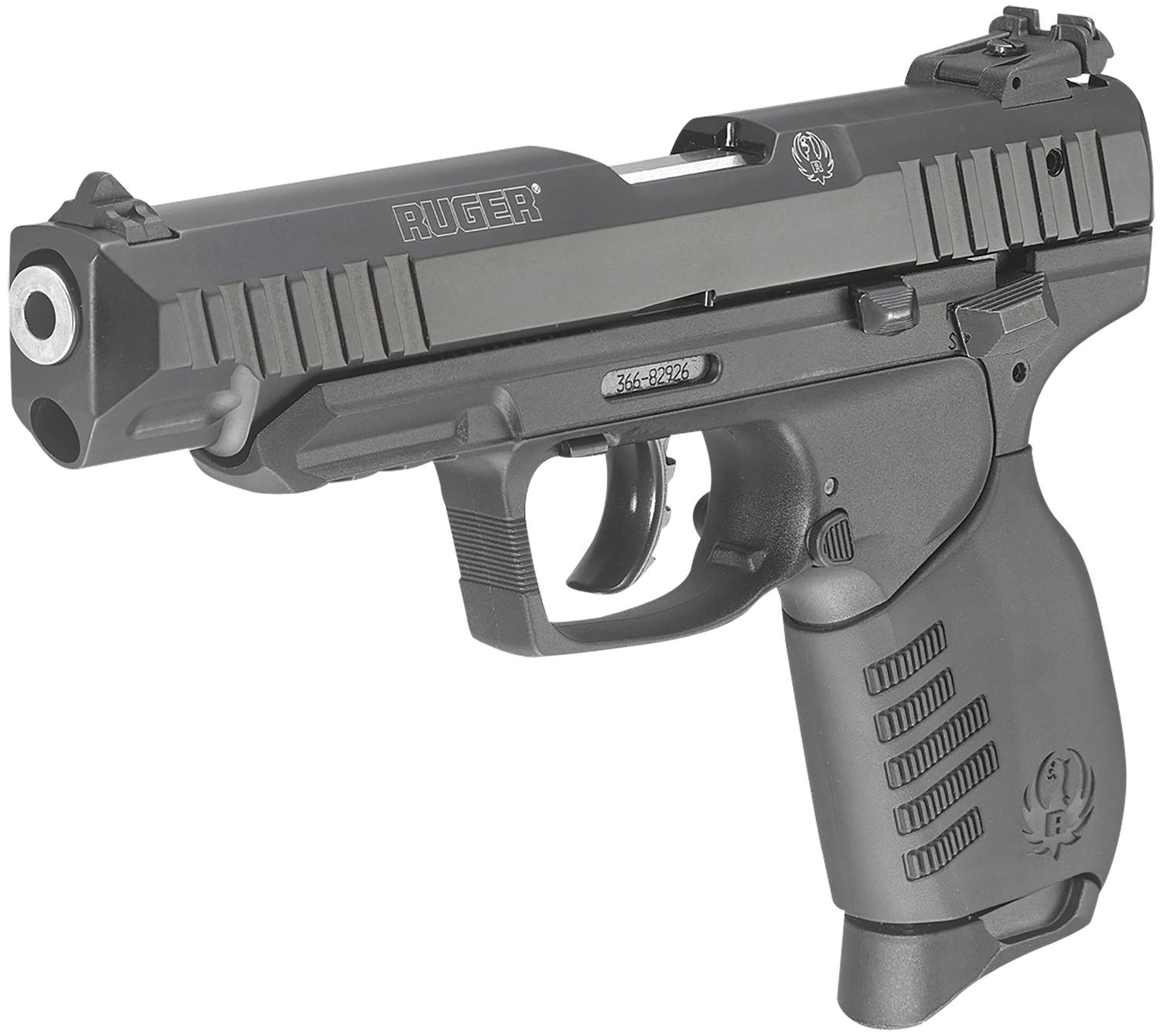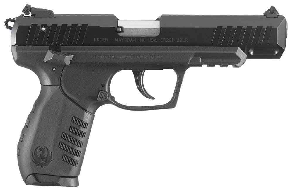 The SR22 utilizes a light double-action & crisp single-action trigger and external hammer. Features are a rounded spur for easy cocking; polymer frame; two interchangeable rubberized grips with angled serrations; aluminum slide has serrations on both the front and rear; dovetailed, high-visibility, three-dot sight system has a fixed front sight and a rear sight that is both windage and elevation adjustable. The easy-to-use underside Picatinny rail features multiple cross slots for variable mounting of most popular accessories. Includes two 10rd magazines and two finger grip extension floorplates.